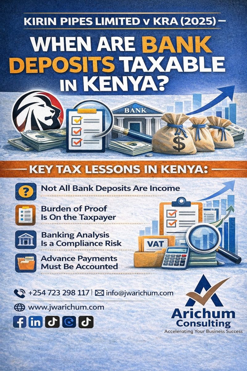 Tax Appeals Tribunal upholds KRA’s right to tax unexplained bank deposits. Learn key lessons on loans, capital injections & VAT compliance in Kenya.
